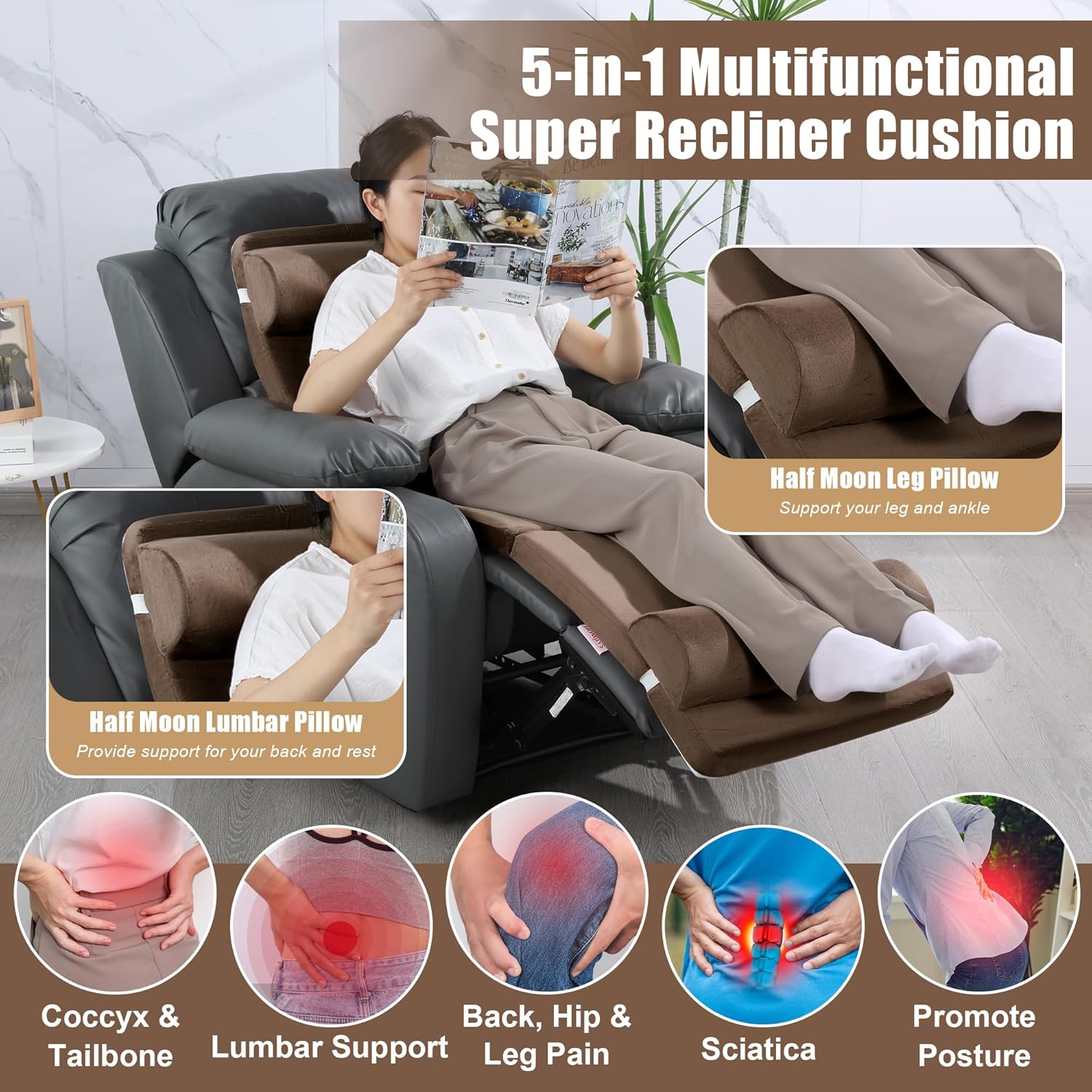 HOMBYS 5-in-1 Recliner Seat Cushion for Elderly+Lumbar Support Pillow + Leg Pad, with Adjustable Half Moon Neck Pillow & Footrest, High Density Foam Filling with Velvet Fabric, Thick & Non-Slip