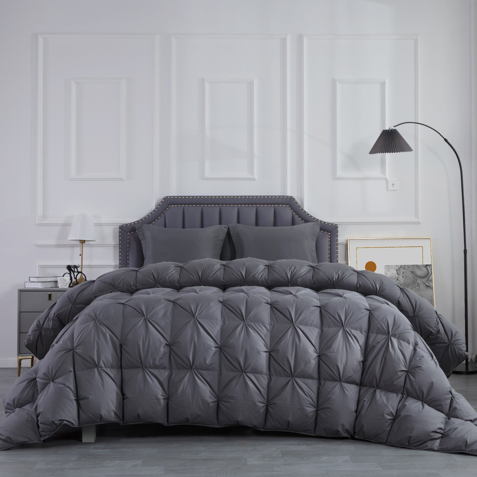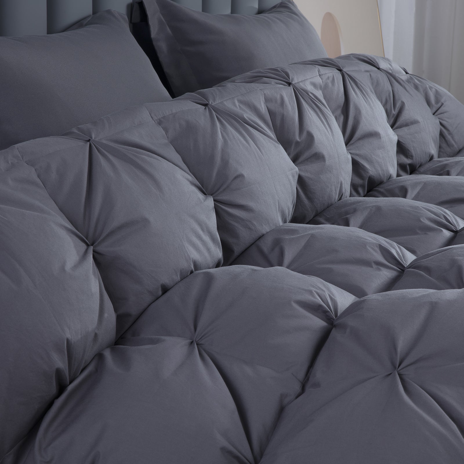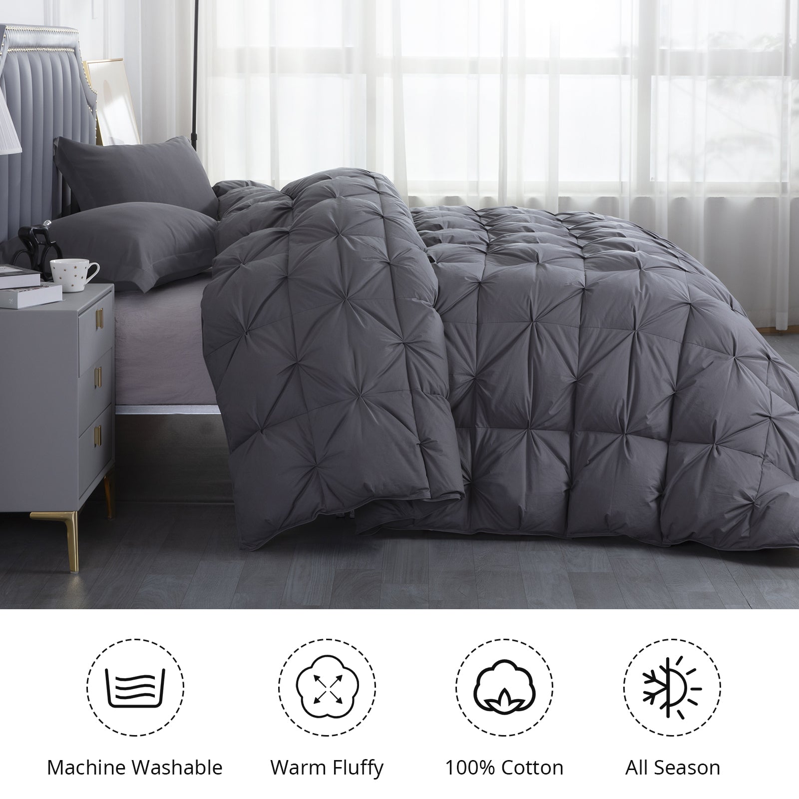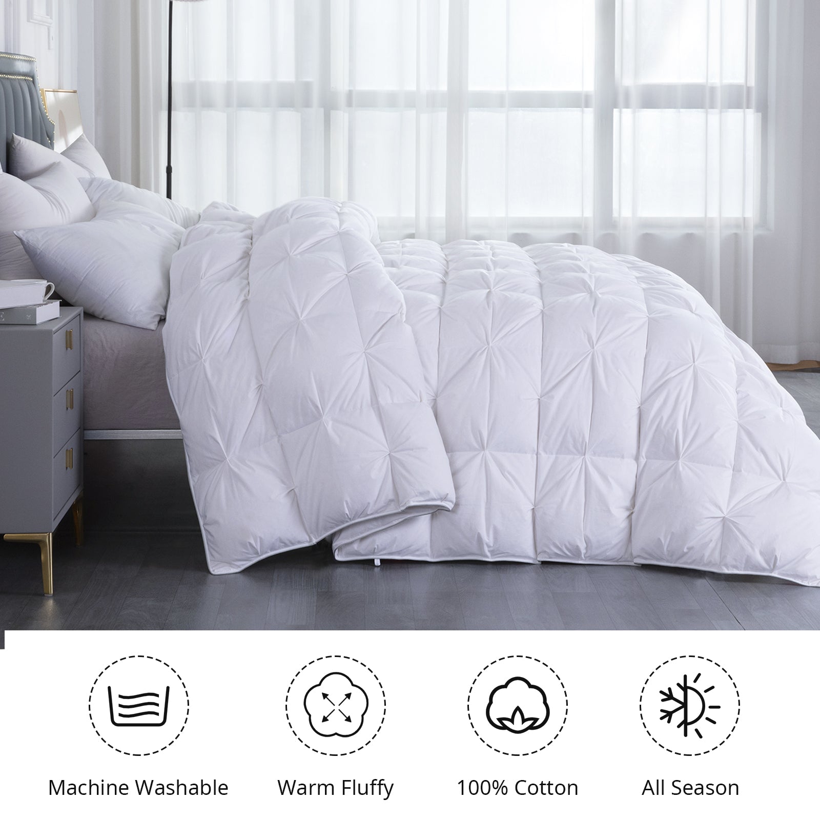 - 【Warmer and More Fluffy】--- Carefully selected latitude 30°N waterfowls, 80% Duck feather and 20% down filling ratio ensures long-lasting cloud-like fluffiness, warmth and softness. Baffle box keeps more heat and warmer than quilt structure, especially suitable for winter cold weather. Exquisite pinch pleat design, can use as duvet insert or a stand-alone comforter.